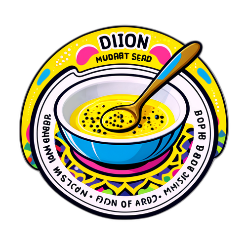 Concevez un autocollant stylisé du fameux pot de moutarde de Dijon, avec des motifs de la cuisine française en arrière-plan.