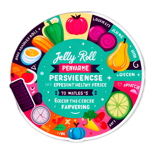 This vibrant sticker celebrates a motivational weight loss journey, characterized by a playful design featuring Jelly Roll. The centerpiece is a bold teal circle decorated with colorful icons representing healthy foods like fruits and vegetables, alongside symbols of exercise. Encouraging quotes about perseverance and dedication are integrated throughout the design, enhancing its inspirational message. This sticker serves as a perfect reminder of commitment to health, making it suitable for placing on water bottles, exercise gear, or personal journals. It can also be used as an emoticon in digital spaces, or adapted into decorative items such as customized T-shirts and personalized tattoos, resonating with anyone striving towards a healthy lifestyle.